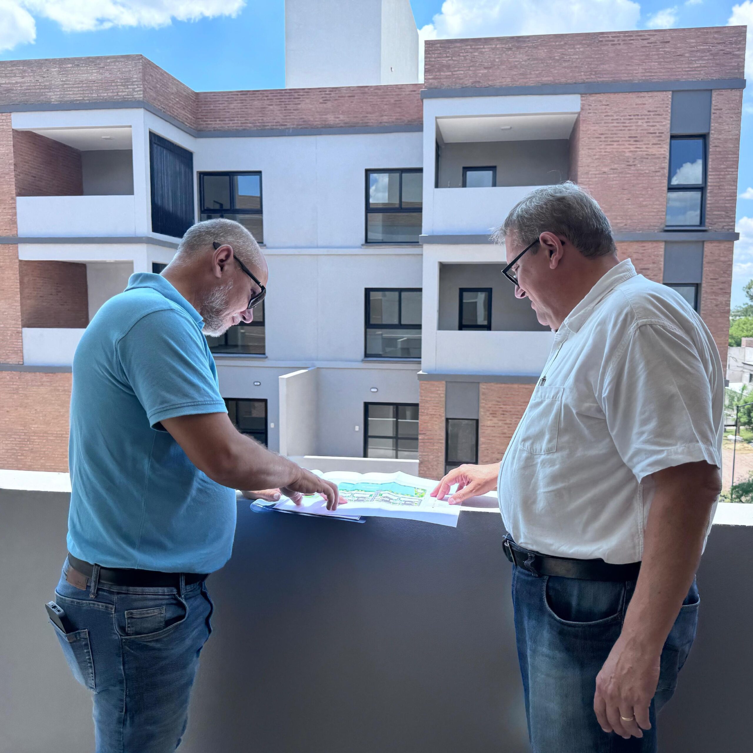 Fernando Berecoechea, presidente del Ipduv, junto al vocal Daniel Monti, supervisaron el avance de las obras. Berecoechea destacó: «Estamos aquí, en la localidad de Presidencia Roque Sáenz Peña, haciendo una visita de obra a estos dos edificios de 16 departamentos cada uno, ya a muy pocas semanas de poder finalizar los trabajos y estar entregándolos con el gobernador de la provincia».