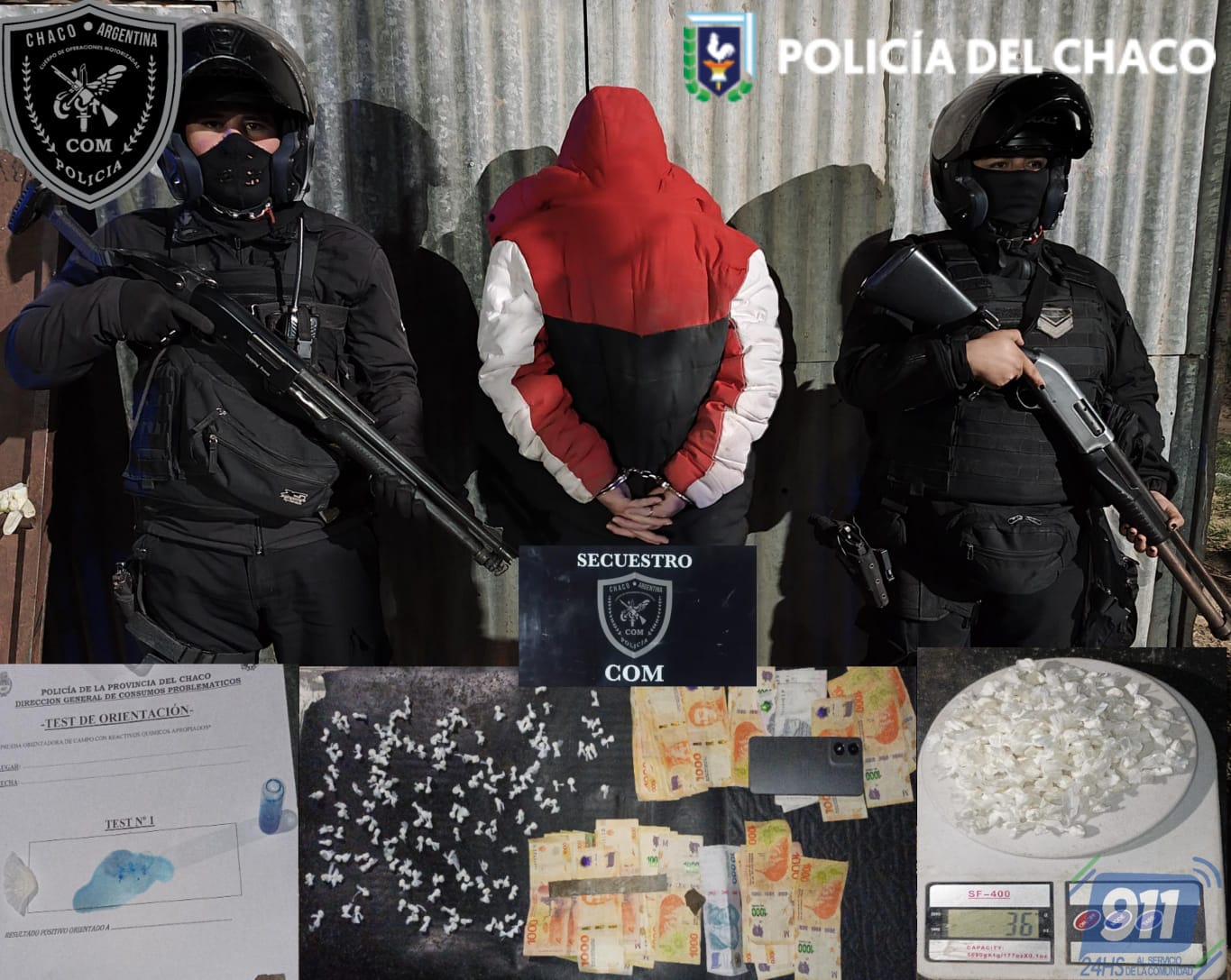 El demorado fue identificado como un hombre de 25 años, quien poseía bochitas con una sustancia blanquecina en su interior. Inmediatamente dieron intervención a la División Microtráfico, dependiente de la Dirección de Consumos Problemáticos. En el lugar, se procedió al secuestró de 36 gramos de cocaína fraccionada en 149 envoltorios, un teléfono celular marca Motorola gris y $55.000 pesos en efectivo.