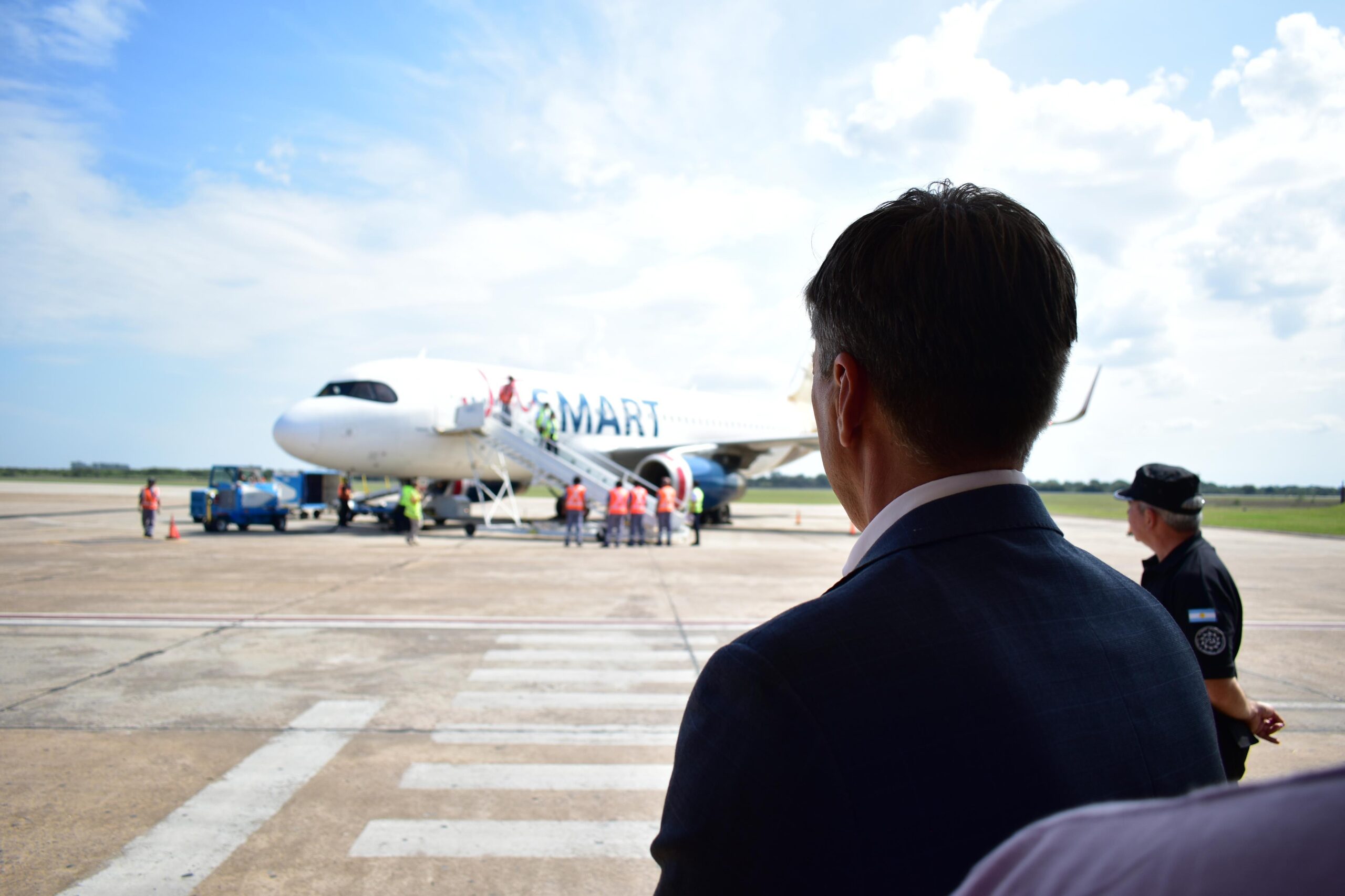 El gobernador Leandro Zdero, junto a la presidente del Instituto de Turismo del Chaco, Verónica Mazzaroli acompañó este miércoles la llegada del primer vuelo de la aerolínea “JetSMART” al Aeropuerto Internacional de Resistencia, inaugurando de este modo, la nueva ruta que conecta a la Capital chaqueña con Buenos Aires. “Mayor conectividad significa mayor desarrollo”, afirmó Zdero, definiéndolo como “una apuesta, no sólo al desarrollo económico, comercial, turístico, sino también una vuelta de página en una provincia que quiere un nuevo tiempo con más inversiones”.