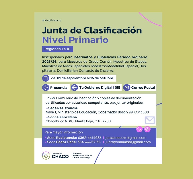 El Ministerio de Educación de la Provincia, a través de las Juntas de Clasificación de Nivel Primario, con sedes en Presidencia Roque Sáenz Peña y Resistencia – que corresponden a las Regionales Educativas 1 a 10-, comunican que a partir del 1 de septiembre y hasta el 15 de octubre se llevarán a cabo las inscripciones para interinatos y suplencias período ordinario para maestros de grado común, maestros de Etapas, maestros de Áreas Especiales, Maestros de las modalidades Especial, Hospitalaria, Domiciliaria y de Contexto de Encierro.